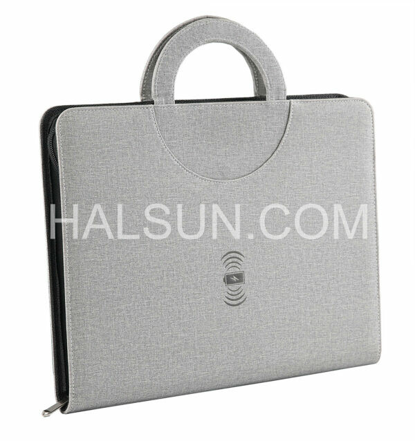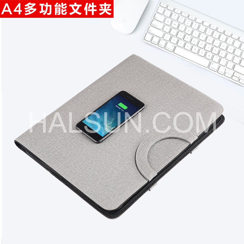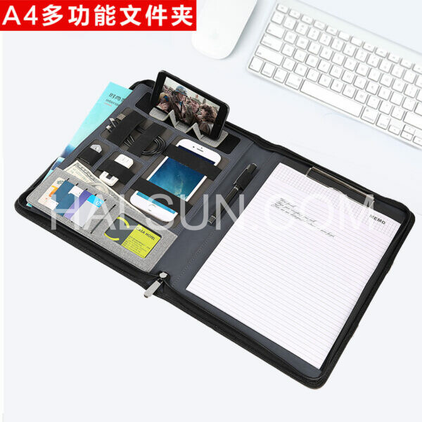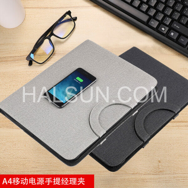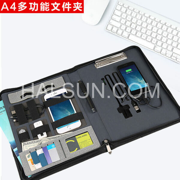 A4 size organizer with built-in power bank and wireless charger, cardholder, memo clip, money holder, phone holder, phone stand, cable and pen holder;