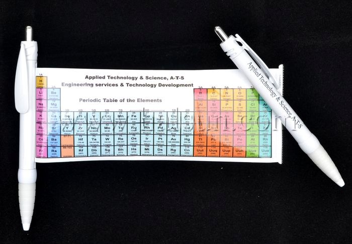 For the students studying chemistry, you won’t find a more convenient storage area for a resource essential to chemistry studies than the Periodic Table Pen. This pen holds a periodic table of the elements on a spring-rolled chart The chart also features an alphabetical list of elements, their symbol, and atomic weight on the back. This is ideal as a gift or student prize. Put you company name on the periodic table pen barrel with one color, or even printed on top of  the chemical elements periodic table with full color offset proccess. It’s long last promotion of your company to students as long as they keep the periodic table pens.