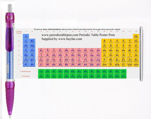 periodic table roll out pensPeriodic table roll out pen is a ballpoint pen with a roll out offset printed periodic table of chemical elements in which the elements are arranged by order of atomic number in such a way that the periodic properties (chemical periodicity) of the elements are made clear. We offer standard form of periodic table on face side ready for you. Just send us your company name, which can be added above table. You can also send us your customized periodic table on face side and back side. (Max size: 168*68mm, format, .ai,pdf, or high quality jpg or other high quality images)
